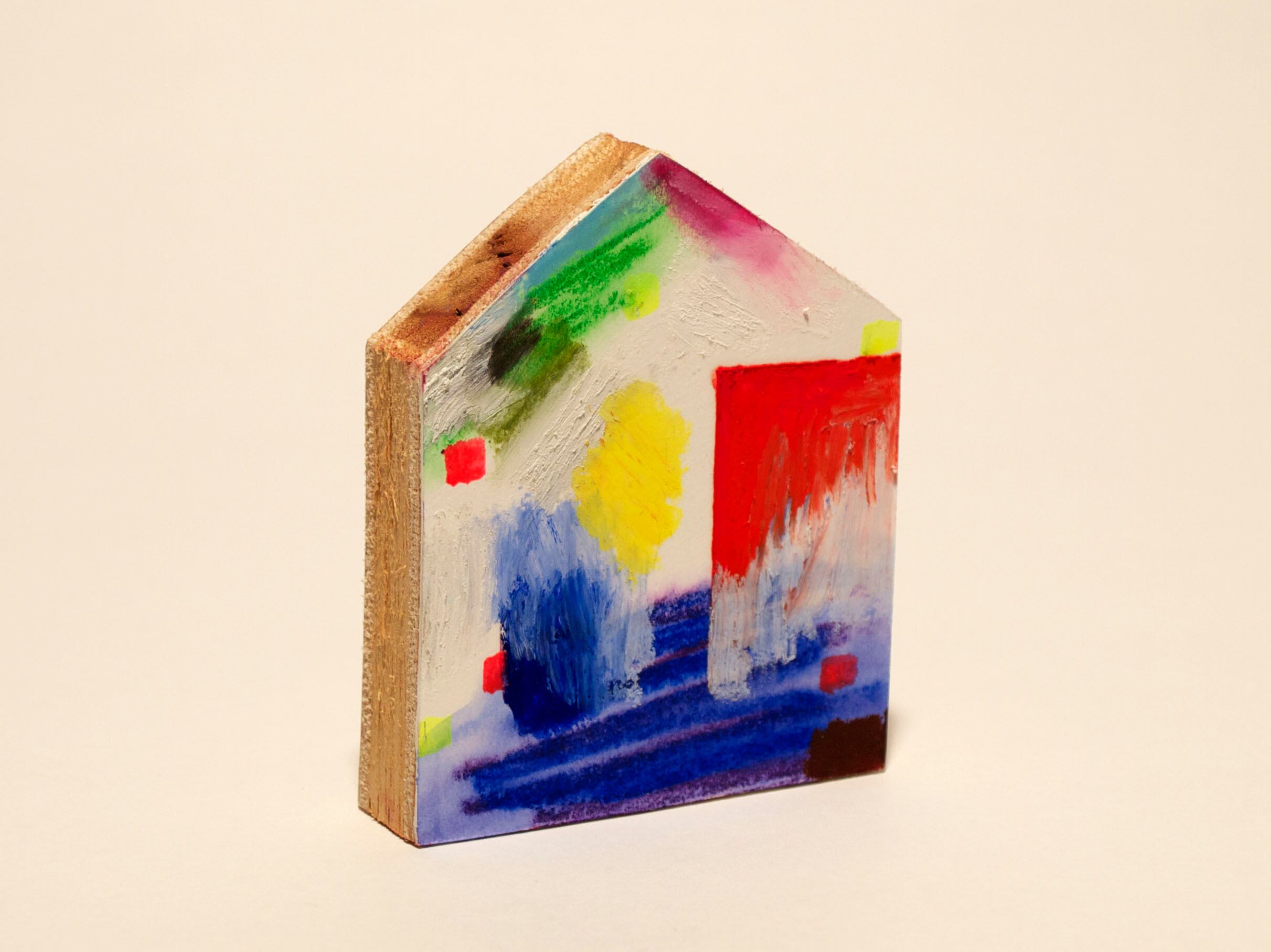 14mm圧の合板を不定形の5角形にカットして、表面に和紙をはりそこに発色のいいセヌリエ・オイルパステルで描きました。小さな作品です。